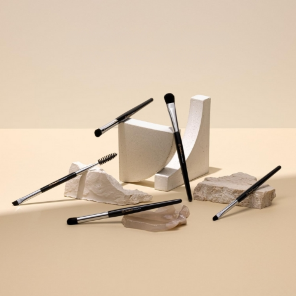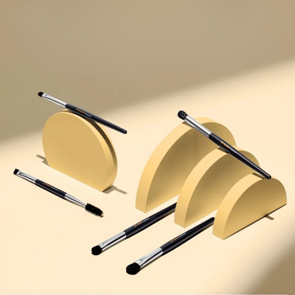 Inclui cinco pincéis fundamentais para maquiagem dos olhos: pincel de sombra, pincel de mistura, pincel de manchas, pincel de definição e pincel de sobrancelha dupla